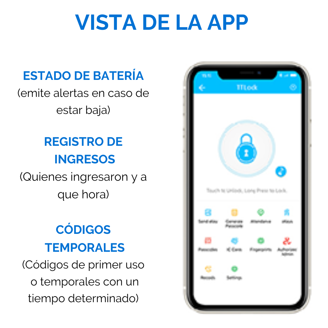 Ingreso por Códigos: Su pantalla táctil incorpora un teclado virtual para ingresar códigos. Puedes usar códigos permanentes, elegidos por vos, o códigos temporales, generados desde el celular, que se eliminan automáticamente después de su uso.