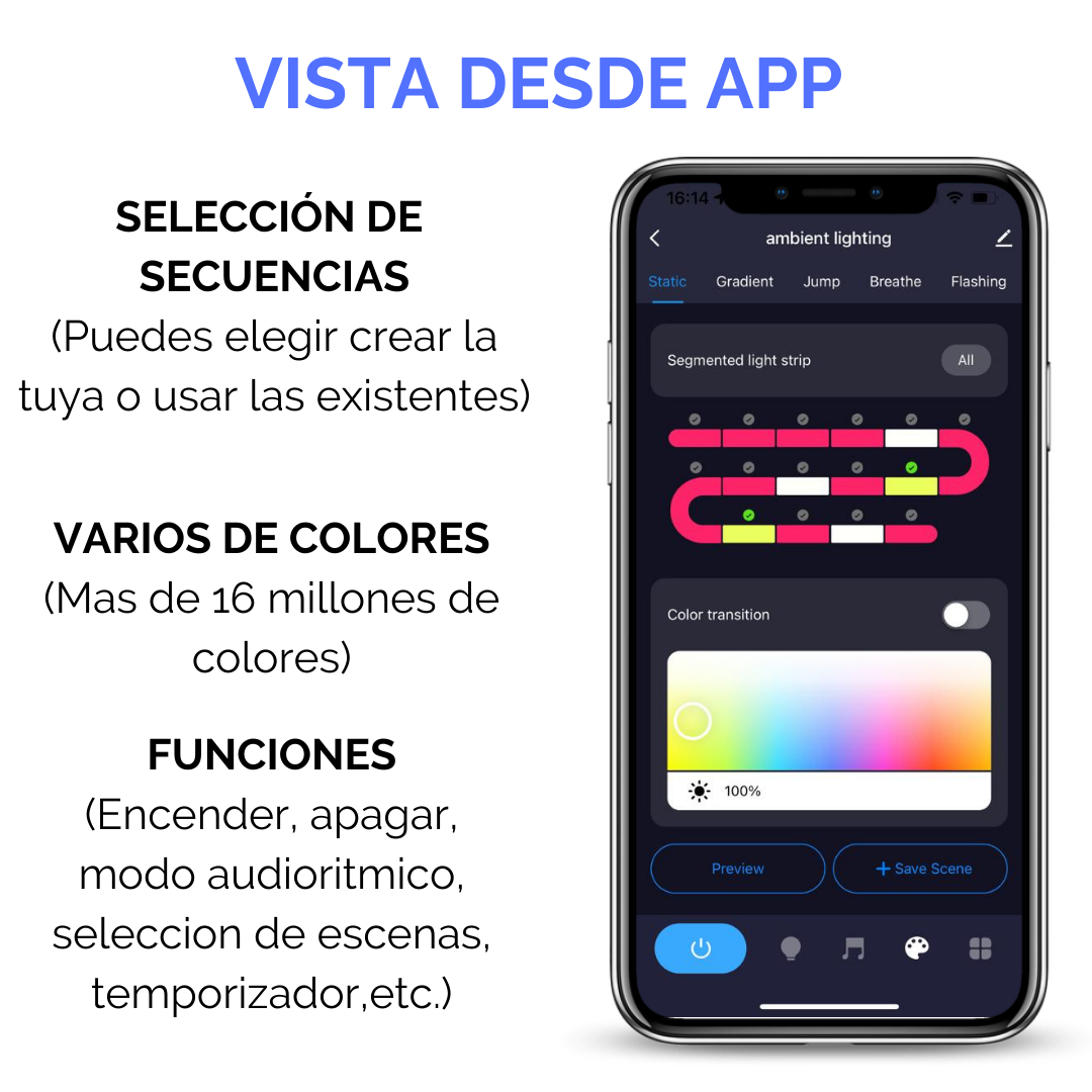Desde su propia aplicación móvil, se pueden variar los colores, elegir secuencias, ajustar la intensidad y nitidez, e incluso establecer horarios de encendido y apagado.