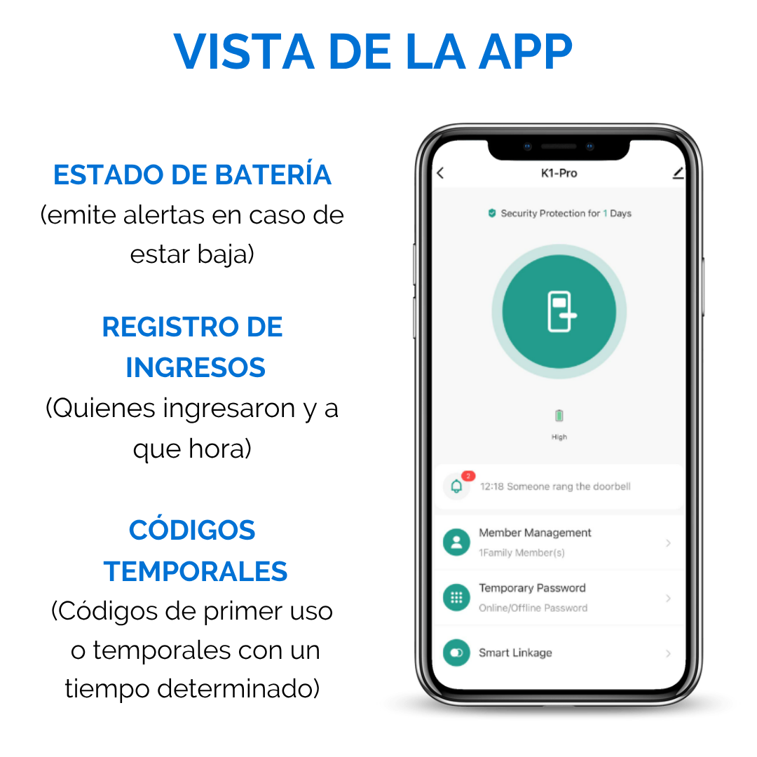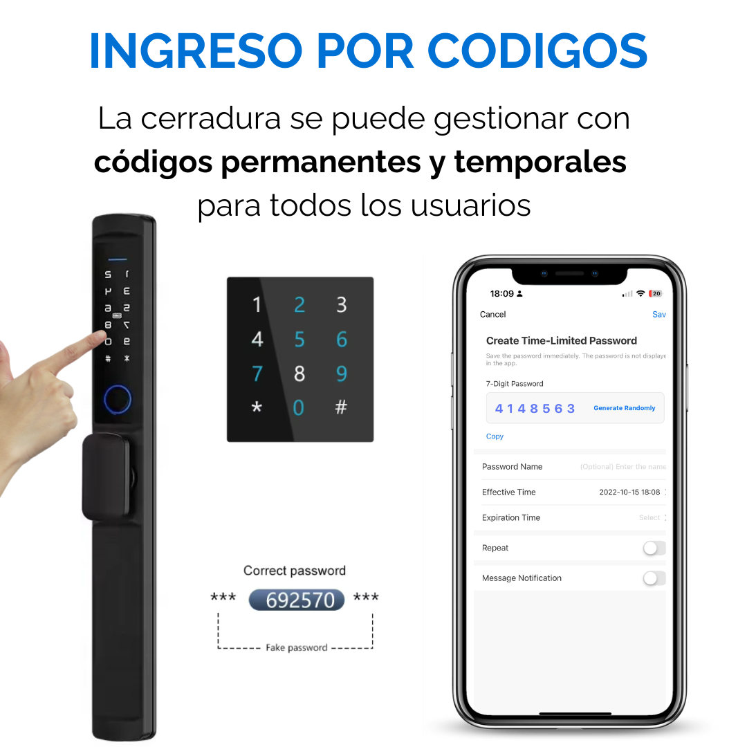 En su pantalla táctil se encuentra un teclado virtual donde podrás ingresar códigos de acceso. Puedes crear códigos permanentes, elegidos por vos, o códigos temporales, generados desde la APP para permitir que alguien entre y luego se eliminen automáticamente.