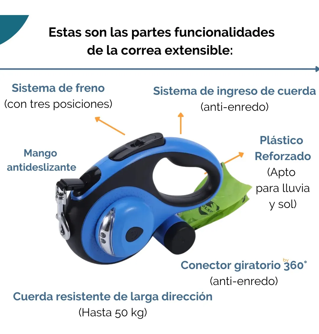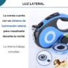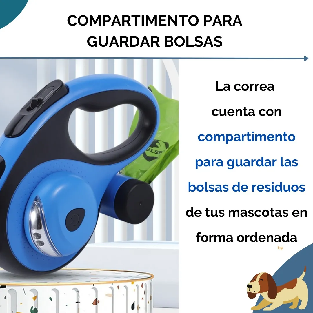 Cuenta con compartimento para almacenar las bolsas de residuos de tus mascotas y también con una mini linterna que se puede pegar a la superficie de la correa para visualizar durante la noche.