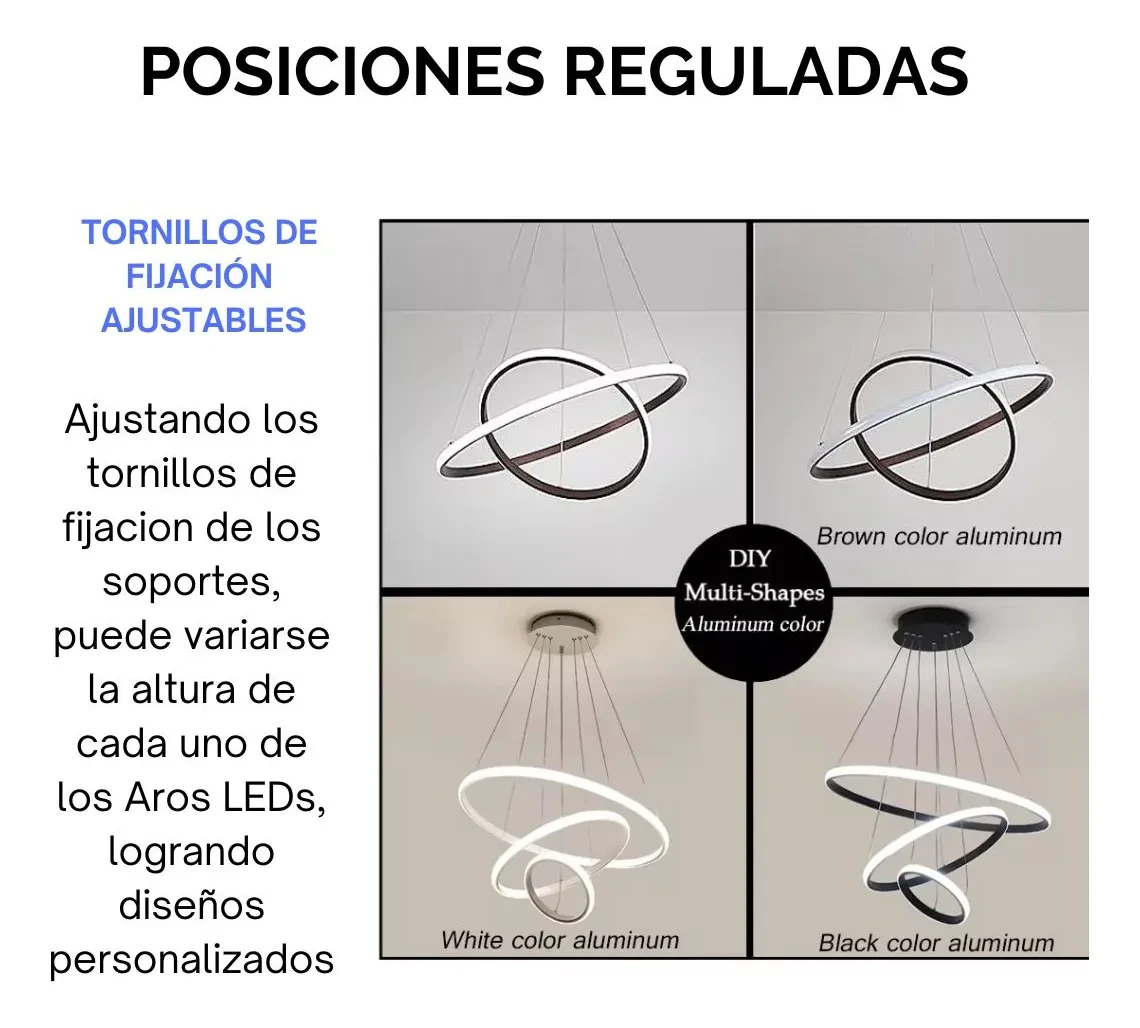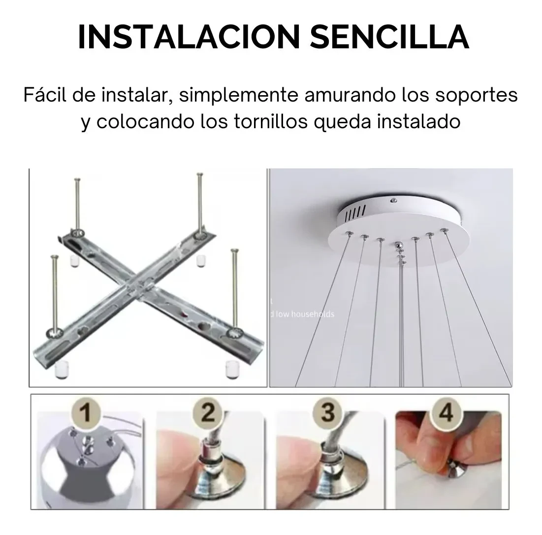 La instalación es sencilla y cuenta con elementos de ajuste para cada anillo LED, para lograr variar la altura y realizar varios diseños.