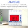 Permite establecer alarmas y acciones por Consumo, Sobre Corriente, Sobre Tensión, Baja Tensión, Baja Batería