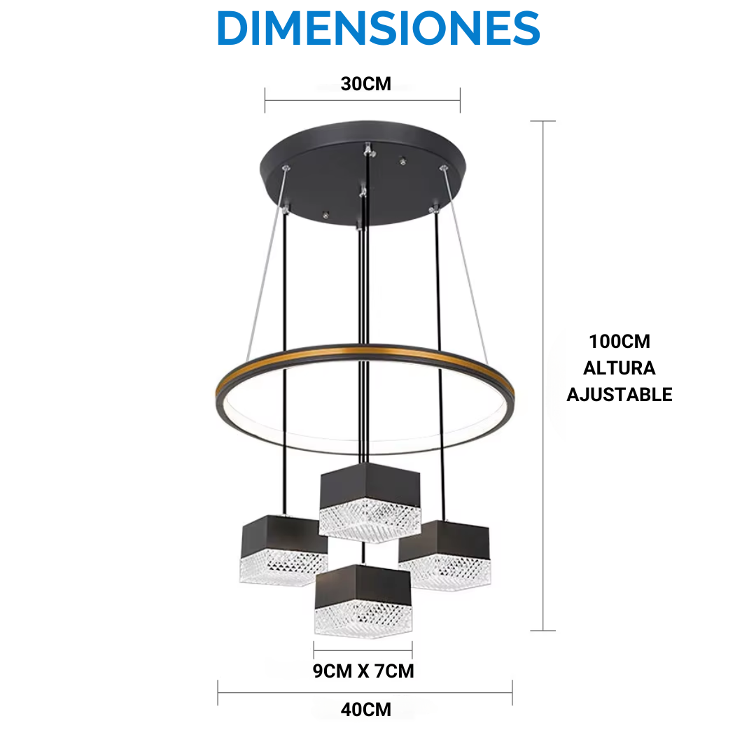 La altura de la luminaria es regulable, para poder seleccionar el largo de mayor conveniencia para tu hogar, en caso de querer regular la máxima distancia desde del techo podrás hacerlo hasta 1mt.