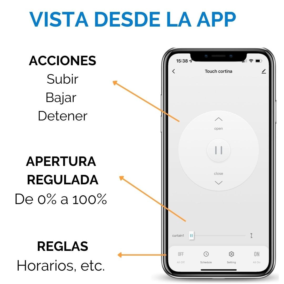 Las funciones principales de este equipo son Subir, Bajar y Detener, además de la posibilidad de realizar aperturas y cierres por porcentajes, logrando un control más preciso sobre la iluminación y privacidad de tus ambientes.
